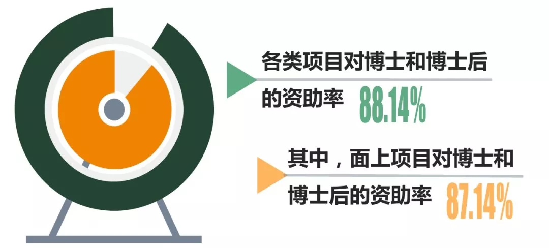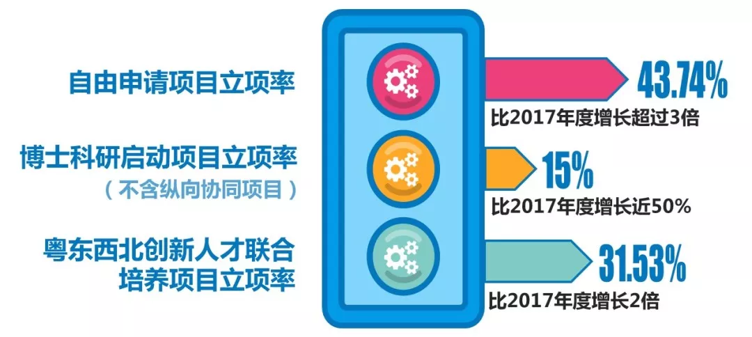 2018年度面上项目(含自由申请项目、博士科研启动非纵向协同项目、粤东西北创新人才联合培养项目)各学科资助率为35%~39%,比2017年度提高了3~4倍。