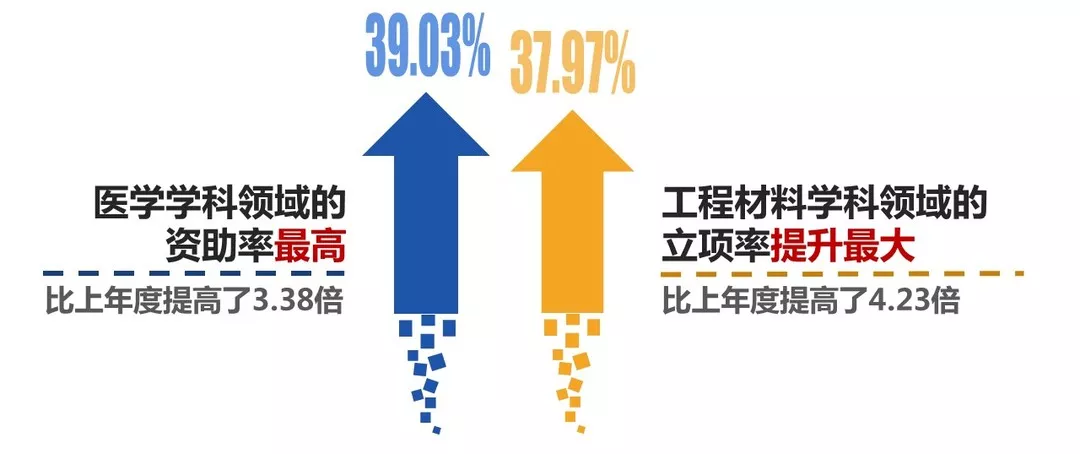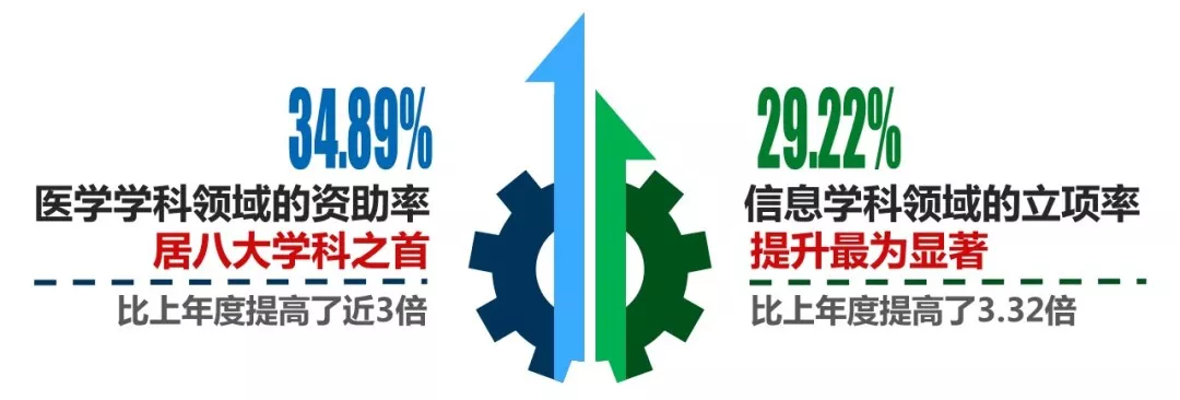 从各学科分布情况看,2018年度省基金各类项目八大学科领域资助率为27%~34%,各学科的立项率均比2017年度提高了2~3倍。